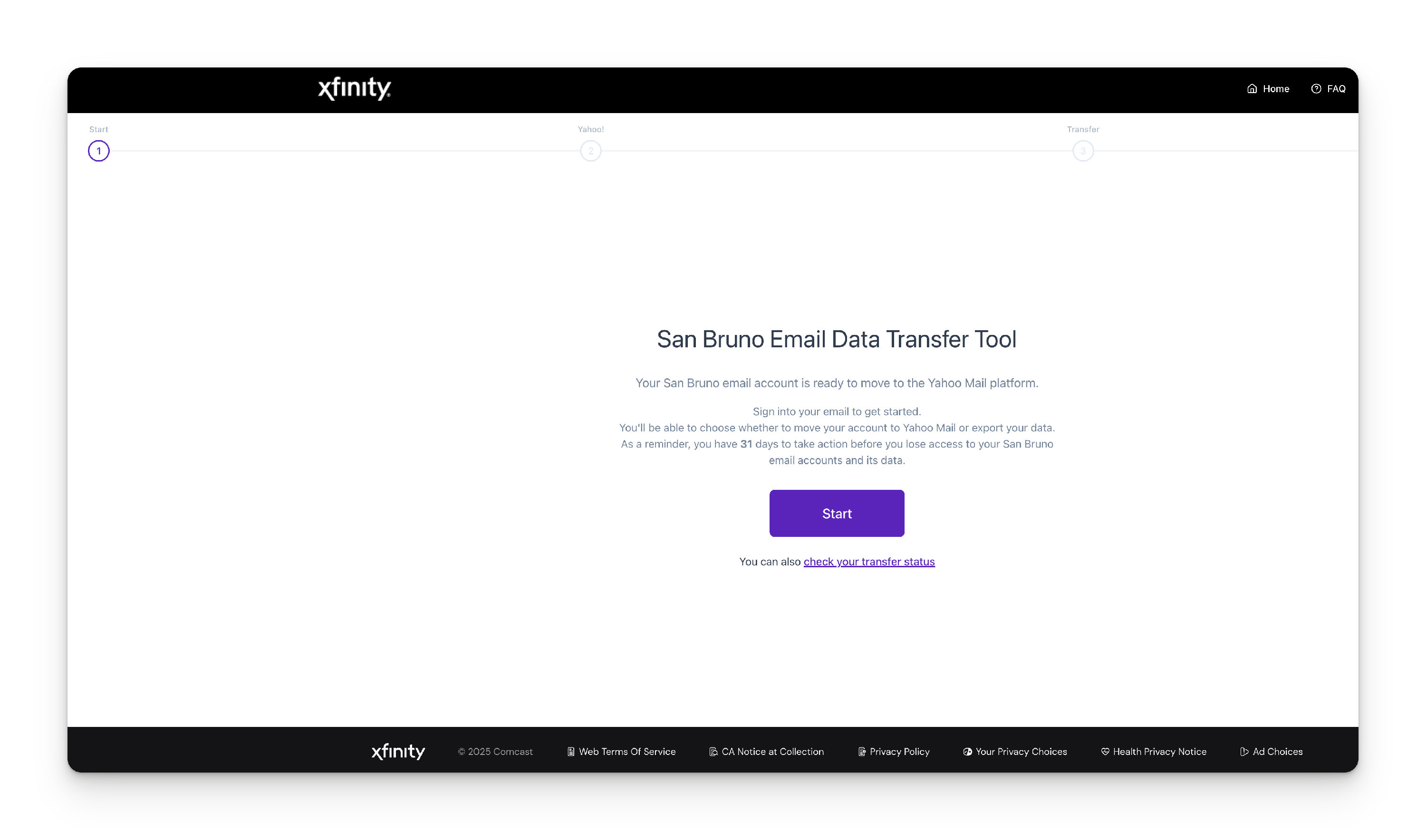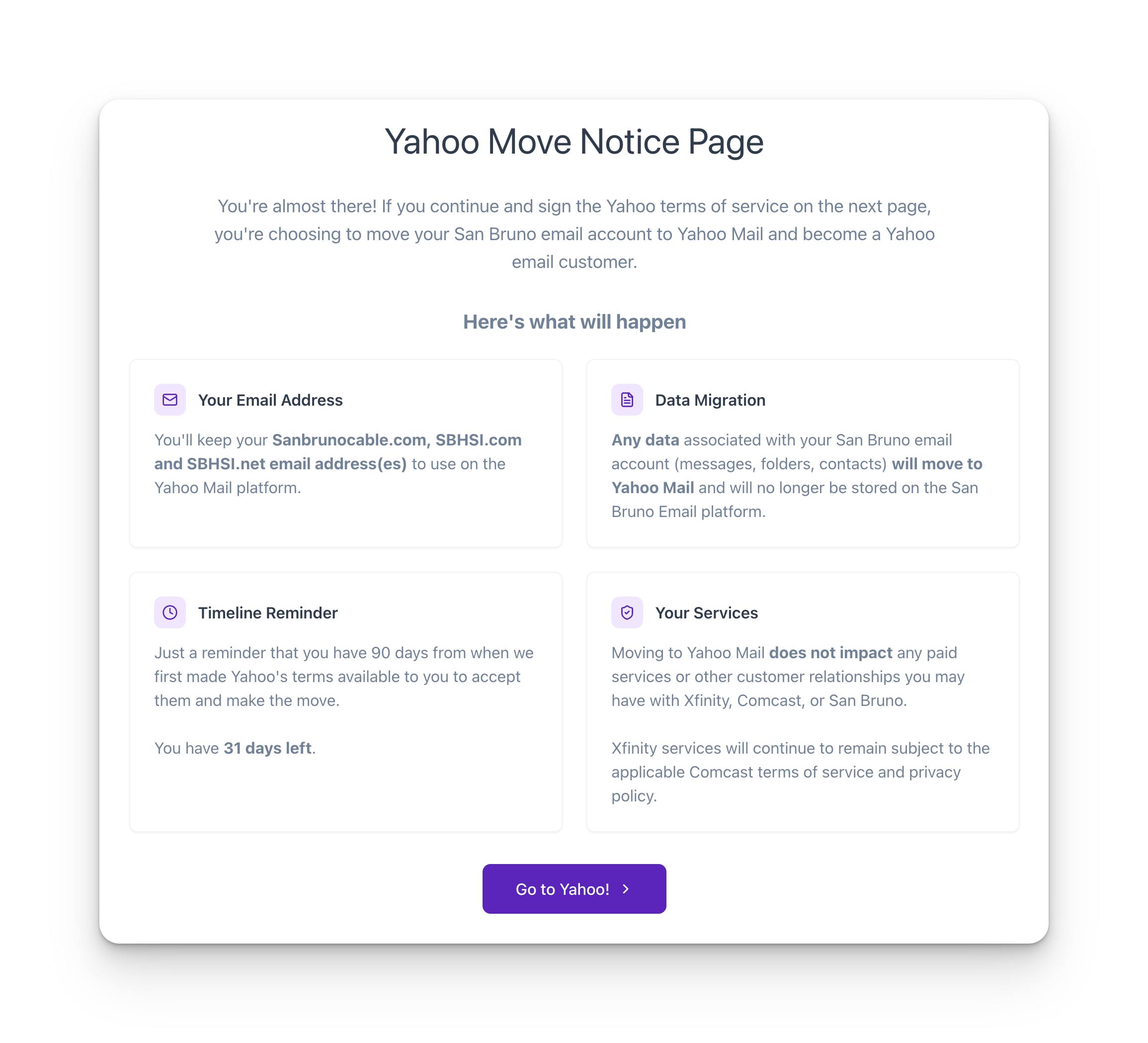 Note: We're redirecting you to Yahoo to start your email transfer. When you sign in, make sure to enter your San Bruno email address, this is required to connect your email to Yahoo. After you finish the quick onboarding with Yahoo, you'll come right back here to start your email move. This should only take a few minutes!